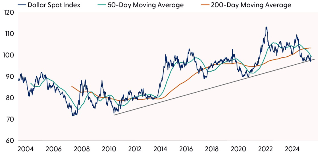 Given the dollar was one of, if not the biggest drivers of EM outperformance last year, we’ll start there. The U.S. Dollar Index is on the cusp of breaking a long-term uptrend. Further weakness would potentially introduce 5% downside or more from a technical analysis perspective. Prospects for two more rate cuts from the Federal Reserve (Fed) and a Trump Administration comfortable with a weaker (but stable) dollar to help balance trade increase the likelihood of a breakdown in the currency at some point.