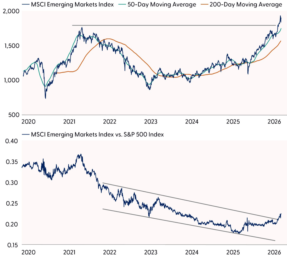 After a stellar 2025 in which emerging market (EM) equities returned 34%, 2026 is off to a good start with the MSCI EM Index up 7% year to date. Last year’s near doubling of the S&P 500 return was driven mostly by a weakening U.S. dollar, which propped up EM returns, but attractive valuations and artificial intelligence (AI) investment played a role. This week we highlight five reasons we’ve warmed up to EM.