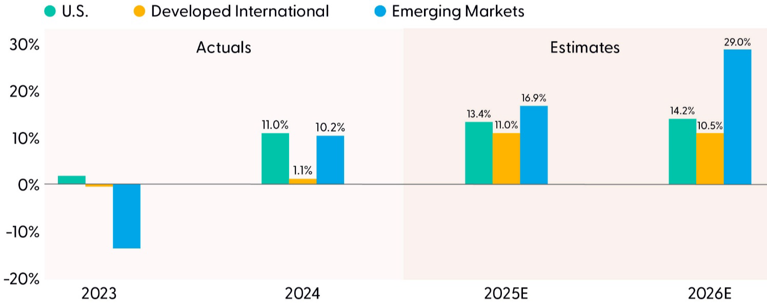 In 2026, EM earnings are expected to grow 29%, more than double current earnings growth expectations for the U.S. at 14%. EM may miss those lofty expectations, but the avalanche of AI investment in Asia and increased focus on corporate governance, efficient capital allocation, and shareholder returns, including in China, South Korea, and India, position EM earnings and cash flows to potentially outgrow the U.S. as well as Europe and Japan in 2026.